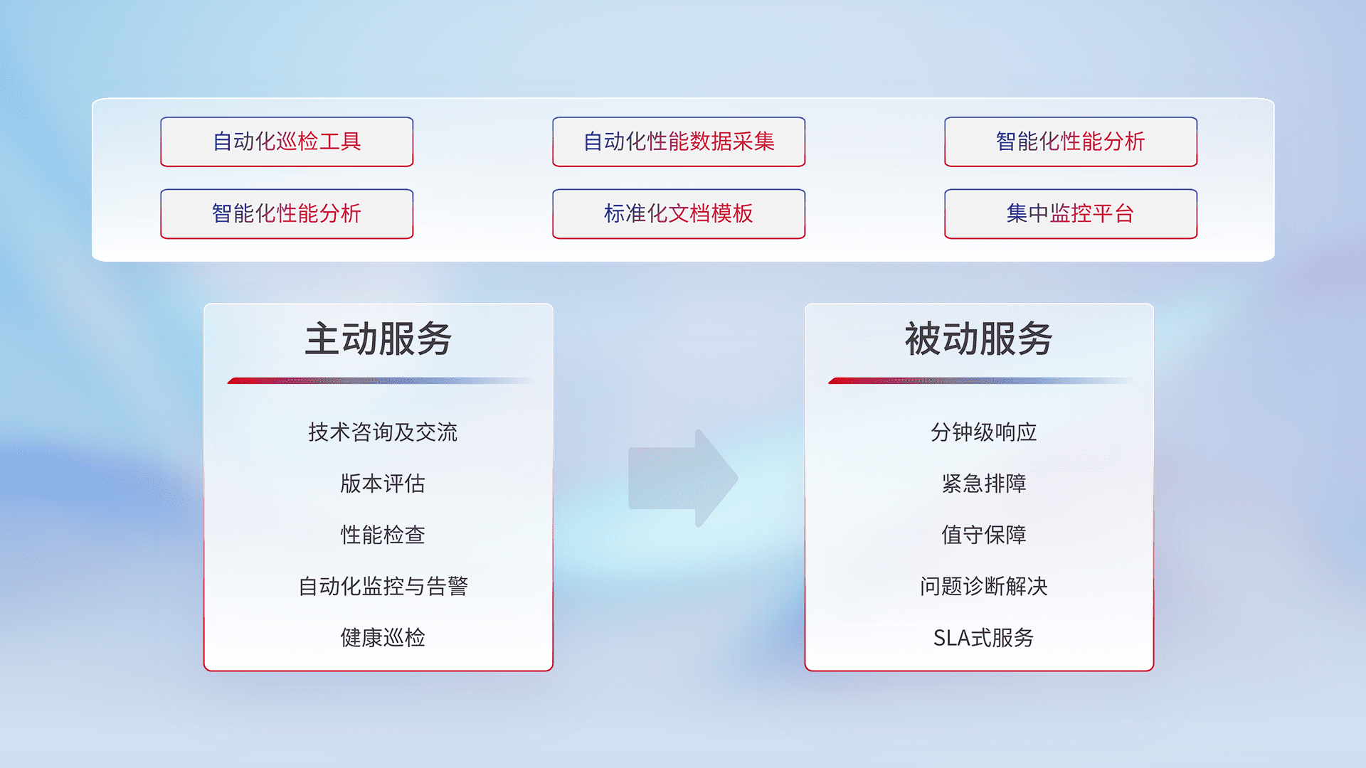 智能化工具和标准化文档,,,保障服务质量,,,提供主动服务(包含技术咨询、、版本评估、、、性能检查、、、自动化监控与告警、、健康巡检)和被动服务包含(分钟级响应、、、紧急排障、、值守保障、、、问题诊断解决、、、SLA服务)。。。。