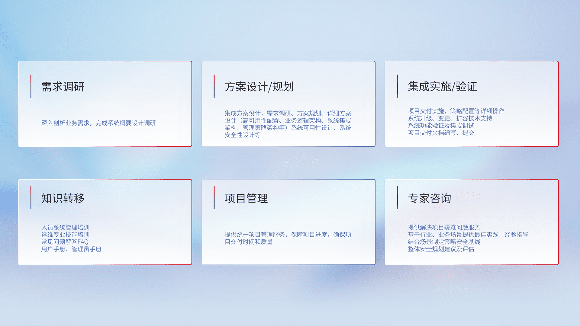 针对客户行业特性,,将宏观的安全战略和需求,,,通过专业的交付服务,,,,实现项目落地,,为客户提供标准规范的集成交付服务。。。。